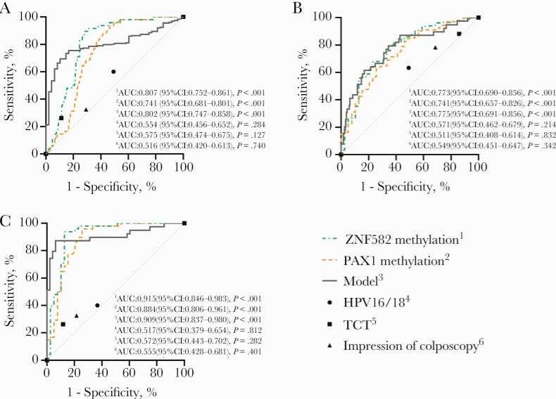 PAX1m、ZNF582m鉴别≤LSIL与SCC(图2C)、≤LSIL与HSIL/SCC(图2A)的能力,从AUC来看是优于HPV16/18、TCT和阴道镜印象。例如图2C中PAX1m的AUC为0.88,可解释为随机选择一个宫颈鳞癌患者和宫颈病变≤LSIL的患者,宫颈鳞癌患者的结果比宫颈病变≤LSIL患者的结果更被怀疑的概率为0.88。PAX1m和ZNF582m侦测CIN3锥切升级为宫颈鳞癌的敏感性均大于82%,同时阴性预测值高于94%。